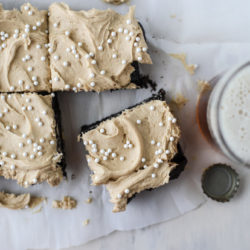 The beer syrup gets mixed into the brownie batter. It gives the best hint of flavor EVER. A tiny bit also gets whipped into the buttercream and now isn’t that just the best thing you’ve ever heard of in your little life? Sugar plus butter plus BEER.