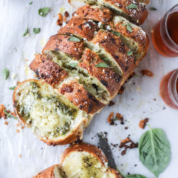 On the slip side, it’s completely appropriate to serve a big loaf of cheesy bread at any party. I mean, it’s usually the first snack I gravitate to at a party, and throw in some pesto? And some roasted garlic? Which is caramely and sweet?