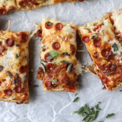 French bread pizzas were one of the first recipes I shared on the site. They are so easy and versatile and I’m not too proud to admit that we used to throw back a Stouffer’s French bread pizza every now and then when I was a kid. And the mac and cheese too. The burnt and bubbly cheese parts. I caaaaan’t.