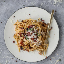 The only downside here is that this recipe does require more time than traditional carbonara since you’re roasting and pureeing squash. You can always do that part ahead of time though. It can be a part of your menu planning on Sundays or if you’re really crunched for time, you could use pureed butternut squash.