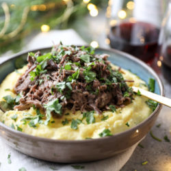 My grandma always made a large beef tenderloin on Christmas day and my mom has been doing the same. I love it – it’s fantastic. But Christmas day is so cozy and PJ-centered and hey-let’s-sit-by-the-tree-and-pour-Baileys-in-our-coffee that I’m thinking we need a polenta short rib bowl come the 25th. You would hear no complaints from me.