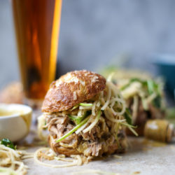 Assemble the sandwiches on the bun of your choice with the maple mustard on the bottom, the pork piled on top and lots of apple slaw!
