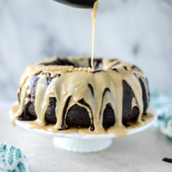 Add the flour and beat on medium speed for 2 minutes. Beat in the cooled coffee cocoa mixture and beat for another 3 minutes. Pour the batter into the bundt pan. Bake for 60 minutes, or until the cake is set and a toothpick inserted into the cake comes out clean. Remove and let cool completely. Once cool, turn the cake out onto a plate or cutting board and drizzle the caramel on top. I like to do a layer of caramel, then a layer of the chocolate ganache, then a layer of the caramel again. Enjoy!