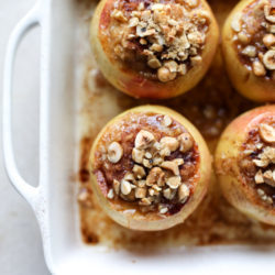 Drizzle each apple inside with some the maple brown butter (but save some for the topping too!). Fill each apple with the oatmeal and top with the hazelnuts. Bake for 35 to 40 minutes, until the apples are softened.