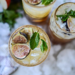 To make the cocktail, rim the glass with cinnamon sugar, using some extra maple syrup on the rim. Fill the glass with crushed ice. Add the mint apple shrub and maple syrup, stirring. Pour in the bourbon and stir again. Add the sliced figs. Top with the seltzer water and serve! You can also use ginger ale or ginger beer.