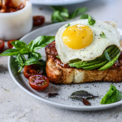 To make the toast, spread the tomato jam on one side. To with the avocado slices and then the bacon. Throw the egg on top and sprinkle with fresh basil. Devour!