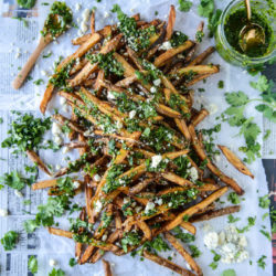 For some reason, I’ve been DREAMING of dipping fries in chimichurri. Like dah-reaming of it. No, I’m not pregnant, and I have no idea where it came from. I think it started after we had lunch at Gaucho one afternoon and I slathered their roasted potatoes in chimichurri. That’s probably it. My taste buds have been begging for the combination ever since.