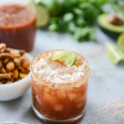 A touch more beer than clamato – and freshly squeezed lime juice. A dash of maggi seasoning (or soy sauce, but the maggi is SO good!), worcestershire (which I normally don’t love), a teeeeeeny drop of hot sauce and lots of chili salt on the rim.