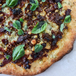 Remove the pizza by sliding it back onto the pizza peel with the help of a spatula. Let the pizza cool for a few minutes before slicing. Top with the extra blue cheese and fresh herbs. Serve immediately!