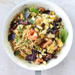 Summer Shrimp and Charred Corn Pasta Carbonara.
