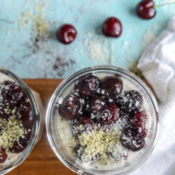 In a large bowl, whisk together the oats, milk, honey, hemp, chia, vanilla and almond extracts and the salt. Spoon a few cherries in the bottom of a glass or jar. Evenly divide the oat mixture between the jars. Use the remaining cherries to top the oats and swirl down into the mixture. Use up all the juice and syrup on the parchment too! Cover the oats and place them in the overnight - or for at least 8 hours.