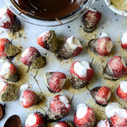 Gently dip the bottom half of each strawberry into the chocolate, placing it back on the parchment paper. Sprinkle the chocolate with graham crumbs. You can stick these in the fridge for a little before serving. You can also use store bought marshmallow fluff, but it might melt easier. If you make them ahead of time, they must stay in the fridge and the marshmallow may run a bit!