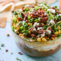 When the dip comes out of the oven, top it with the corn, gorgonzola, bacon, wing sauce, green onions and cilantro. Dig in!