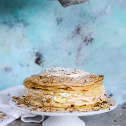 When you're ready to make the cake, take the cooled crepes and spread a few tablespoons of the almond cream on top. Make sure it's a VERY thing layer! Or else the weight of the crepe cake will cause the lowest crepes to shirt. Repeat with all the crepes and add powdered sugar or almonds on top. Refrigerate for 1 hour before slicing.