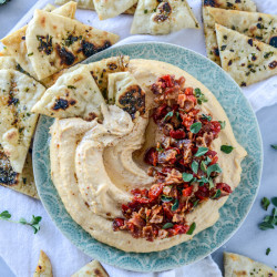 I can’t take credit for the idea of this recipe. I spied it on serious eats because Eddie and I have been in crazy hummus mode. We go through phases where we aren’t interested in it for a month or two and then bam – our fridge has two family sized containers and we demolish them in one weekend. Do you get me? The hummus obsession is real.