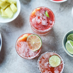 To say I freaked over these little drinks would be an understatement. While they turn red from the strawberries, they are quite pineapple-y and it’s hitting every tastebud I’m feeling at the moment. Right now, I’m thinking puffy tacos, thin and crispy chips, tons of guac and fresh salsa. I like to add a few shavings of lime peel right into the drink too because it’s so fresh and bright.