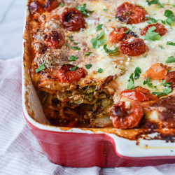 In a bowl, mix the ricotta, parmesan, basil, oregano, salt and pepper together. Spray a 9x13-inch baking dish with nonstick spray. Spoon about 1/2 cup of tomato sauce on the bottom of the baking dish and top with 3 lasagna noodles. Next, start your layers. Cover the sauce with a third of the roasted veggies. Drop spoonfuls of the ricotta mixture on top of the veggies, then pull apart one of the burrata balls and scatter it evenly over. Top with handfuls of the grated cheese. Add another few spoonfuls of marinara, then place 3 more lasagna noodles. You want to do this two more times for two more layers. I finish the last layer with a top layer of lasagna noodles, smothered in tomato sauce and the rest of the grated cheese. I like to add the leftover cherry tomatoes on top of that.
