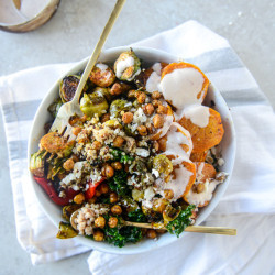 To make the grain bowls, combine the grains in the bottom of the bowl. I like to massage the kale with the sesame oil and let it sit for 5 minutes, then toss it in with the grains for some extra green! Add on the brussels, sweet potato and roasted red pepper. Top with the chickpeas and the feta. Drizzle with the chipotle crema if you'd like. Eat up!