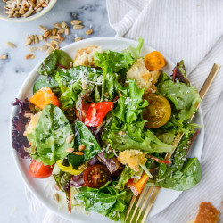 Add your greens to a large bowl and season them liberally with salt and pepper. Add the rest of your ingredients, your croutons and dress!