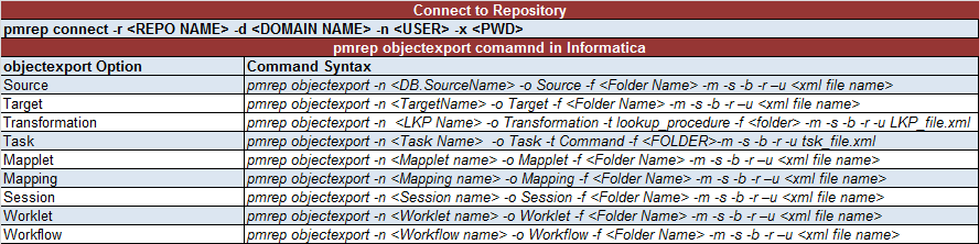 Vishal Lambe | pmrep command | click on the image to enlarge 2. pmrep objectexport The pmrep objectexport can be used to export XML definitions of various objects like workflows, sources, targets etc. Below is the complete list of all the options available with pmrep objectexport with their syntax.