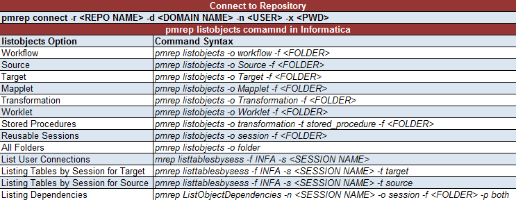 1. pmrep listobjects The pmrep listobjects command can be used to list assocaited workflows, sources, targets etc. Below is the complete list of all the options available with pmrep listobjects with their syntax.