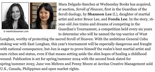 Last year, I was approached by Shannon Lee, the daughter of Bruce Lee, who asked me if I would be interested in collaborating with her to write a series of young adult fantasy novels inspired by her father’s life, writings, and philosophy. Bruce Lee is such an influential figure to me, so of course, my answer was a resounding yes. I’m excited to share the news that the Guardian of the Scroll duology has now sold to editor Mara Delgado-Sanchez at Wednesday Books, for publication in 2024 and 2025.