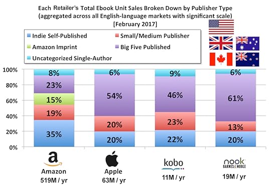 When people buy books via their favorite online retailer most of them come from publishers such as Simon and Schuster or Penguin Random House. Out of the 19 million Nook Books that were sold from early 2016 to early 2017 61% of them stemmed from the big five. Apple sold 63 million e-books during the same time period and 54% of total unit sales were from big publishers. Kobo sold 11 million e-books and only 46% of them were from the big guys. Amazon sold over 519 million Kindle Books, but only 23% of them were from the big five.