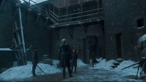If you watch the sparring scene in [season seven episode four, “The Spoils of War”] between Arya and Brienne, when Arya asks, “Didn’t you vow to serve both my MOTHER’s daughters?” – at the word MOTHER you can see a woman in a long green dress w/ long auburn wavy hair with her head down walking past the background gate, resembling Cat. If it’s unintentional, it’s awesome. If not, more awesome. Catelyn cheking on Brienne keeping her vows.