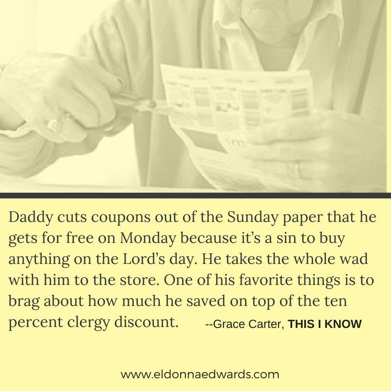 When drawing the character of Reverend Carter in THIS I KNOW I drew from my own experience of growing up with a man who could squeeze 200 pennies out of a dollar. He accepted gifts of venison from church members and had it ground with pork suet so his kids wouldn't balk at the wild taste. He milked his clergy discount wherever and whenever he could, often embarrassing my mom. And he cut coupons like nobody's business, stuffing his suit pockets, his wallet, and the glove compartment of our Plymouth until the little door wouldn't stay shut.