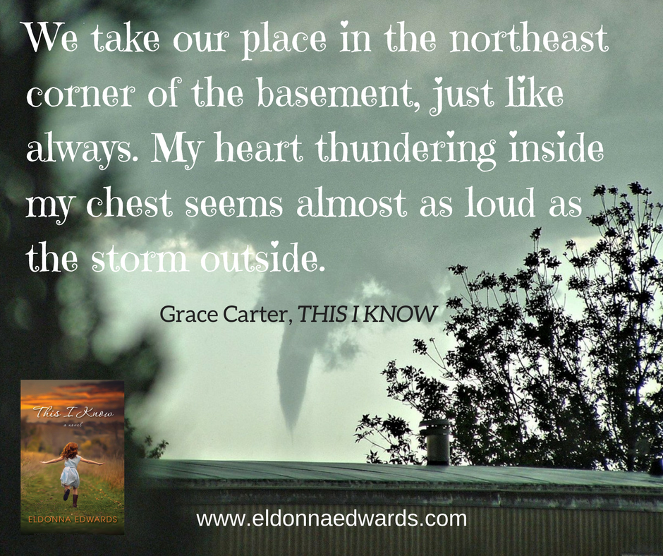 One of my favorite scenes to write in THIS I KNOW is when the family huddles in the basement of their home as a tornado passes overhead. Just recalling the hush of a sticky wind right before the warning sirens pierced my young ears sends me reeling backward in time. I can feel the humidity on my skin, smell the dank corner of our parsonage basement, feel the fear of my family as we waited for the all clear on our transistor radio.