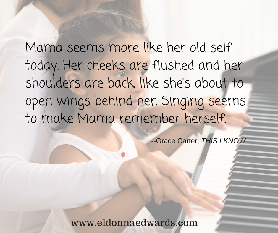 When I created the character of Isabelle, wife to the Rev. Henry Carter and mother to four daughters in THIS I KNOW, I gave her my own mother's beautiful voice. And then I took it away from her when Mrs. Carter suffers an unbearable loss. I wanted the reader to feel her deafening silence, how grief not only stills our hearts, it will come like a thief for your tongue and the soul that feeds it. But also how music just might be the one thing to make you feel whole again.