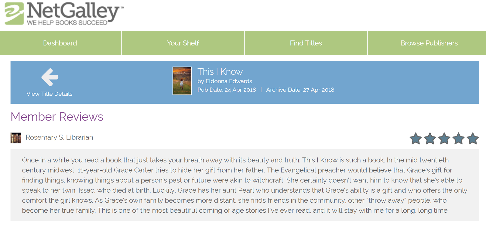 "Once in a while you read a book that just takes your breath away with its beauty and truth. This I Know is such a book.This is one of the most beautiful coming of age stories I’ve ever read, and it will stay with me for a long, long time." --Rosemary S., Librarian