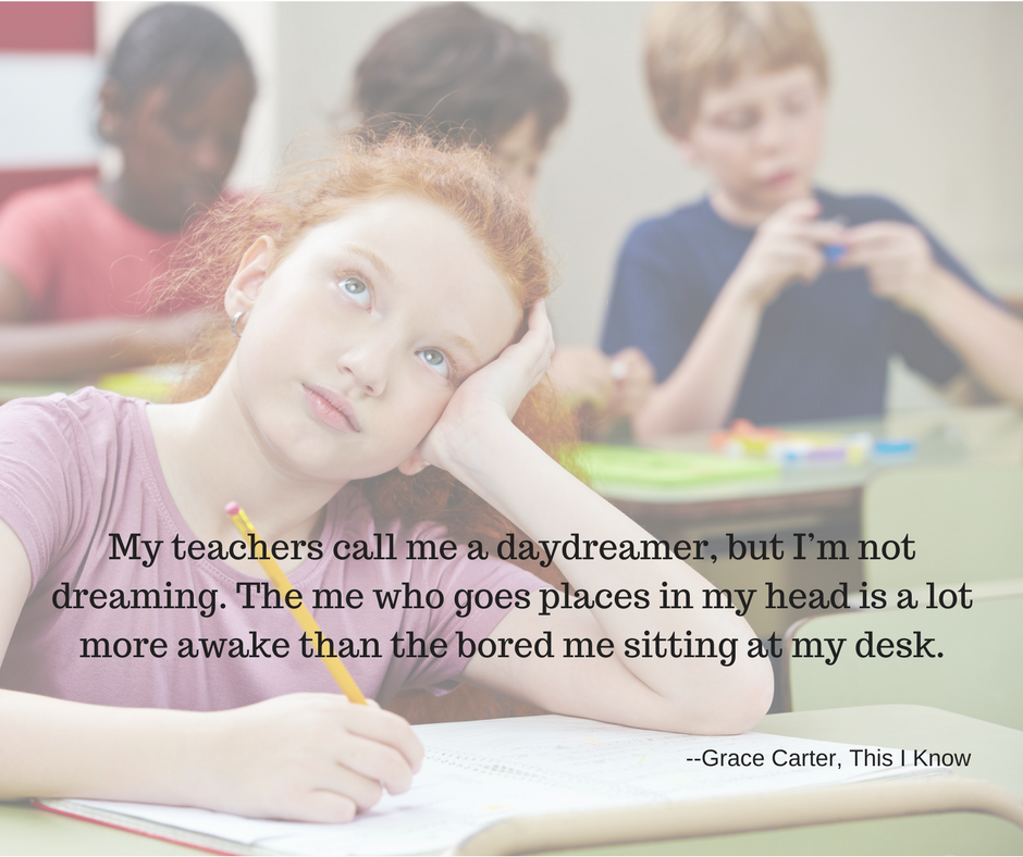 They always say you should write about what you know. Even as I tapped away at this post I stopped and started at several times, distracted by a bird on the wire, the sound of my neighbor yakking loudly in her driveway, then imagining that bird knocking the cellphone out of her hand. I suppose it comes as no surprise then that I gave my young protagonist, Grace Carter, the same penchant for losing herself in the world beyond her immediate surroundings. Because this? This I know.