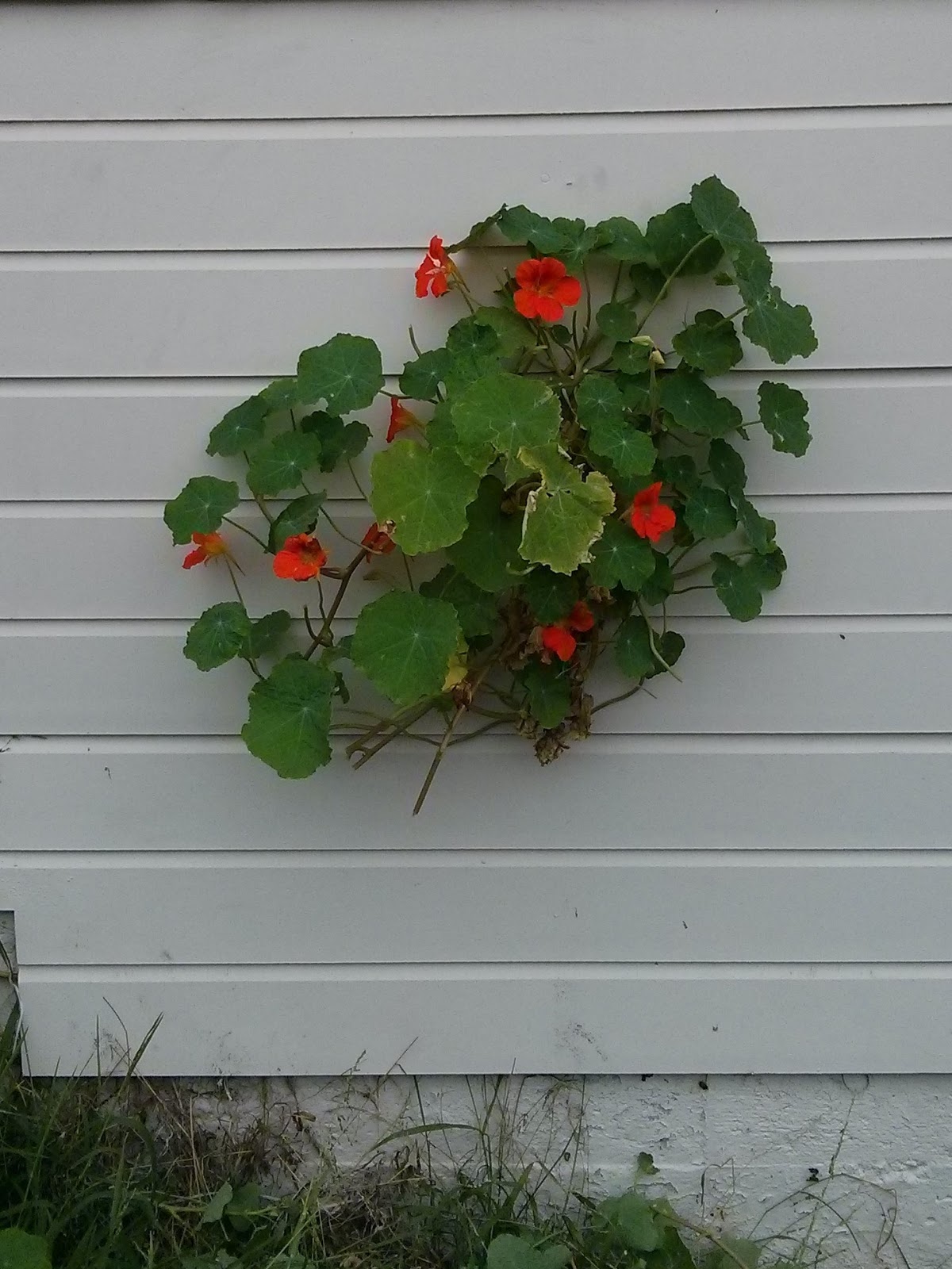 The sky is not my limit. I am. --T. F. HodgeA couple years ago this nasturtium crawled across our yard, into the neighbor's yard, and over their walking path. Sadly, the gardeners cut it down. Not to be deterred, the plant snaked into the foundation, twined up a basement wall, and found its way back to the light through a tiny crack in the siding. From my window the plant appeared to be floating like one of those gurus who levitate above the ground. But this isn't an illusion. This flower succeeded simply because it persisted. It was not in its nature to give up.