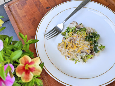 Ingredients Rice - I used white rice1 tbsp. ButterGarlicYellow OnionCremini MushroomsCeleryThymeFlour - I used gluten freeDry White WineChicken BrothBroccoliSour CreamShredded Chicken - I used RotisserieShredded Cheddar Cheese