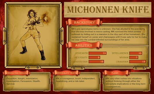 As a bonus, I decided to get a faux-D&D player card designed to show the audience just what MICHONNEN_KNIFE (+1 if you can guess both references embedded in the name) has to offer Jenaiya. Hope you enjoy perusing it, and if you’ve dug this blog post, you can get lots more obscure references throughout the whole of ‘Playing Dead.’