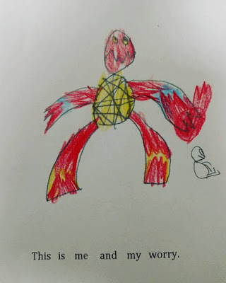 I love my six year old's drawings. This one is of him and his worry. Apparently, his worry is a large creature that kinda resembles a flaming turtle that holds a fire ball over his head. He looks happy though. I know my worry would be a whole lot scarier. This weeks worry is brought to you by hurricane force winds and record breaking rain. Fortunately, we didn't lose power or have a tree fall on our house, like so many people in our area. We survived.