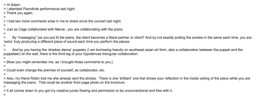 …still buzzing from last night. By the end of Crazy N**ger—and this has happened to me twice now in this piece—I actually forget/forgot how to read clock time. My brain turns to mush, short circuits. Both times I sort of stopped playing at 53:30, when it should end at 53:50. I bring myself back in, but it’s the weirdest thing. The first time I ever did this, I was mad for three days. Last night I had to just smile, thinking of the time Mary Jane Leach, who rescued Eastman’s music from oblivion, told me that strange stuff sometimes happens to her when she’s working with Eastman’s music. The computer shuts down. Emails bounce for no reason. So when I actually misread the ending-time *again* (despite huge warnings I scrawled in giant letters in my score, and after telling the story about the first time it happened like ten times yesterday) I had to figure this was just Eastman saying hello—a little zap from beyond just to let me know who’s still boss. Till next time, man.