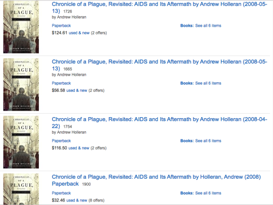 Andrew Holleran’s truly brilliant Chronicle of a Plague begins with a foreword describing how the original edition of the book, Ground Zero, had languished into obscurity, almost un-findable, and how strange he felt creating an updated version of a forgotten book. So it’s interesting and a bit troubling to see that updated book now (which is so goddamn good, people) listed on Amazon as a kind of rarity. Meanwhile, Ground Zero is like $0.01.