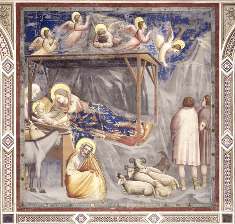 About Giotto’s frescoes, Katia Amore writes: “Giotto did something entirely new: his figures are not stylized or elongated, they are solidly three-dimensional, have faces and gestures that are based on close observation, and are clothed not in swirling formalized drapery, but in garments that hang naturally and have form and weight…characters face inwards, with their backs towards the observer… [The] Virgin…casts a long, sad look at the Infant. We may suppose that with her power of prescience, she is gazing into the future to the time when she must give Him up to fate. Giotto views the Nativity in an entirely new light - that of intense human drama.” (Amore, Katia. “Revolutionary Giotto: The Nativity Scene Inside Padua’s Scrovegni Chapel.” Italy Magazine, December 2014)