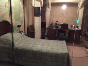 The entire block of rooms were predicated on the supposition that at some point, the top military and political figures of Britain might have to live there indefinitely. As it turned out, Churchill only slept there for four nights, and he demanded that his wife, Clementine, stay there too. Here are their bedrooms. Notice the telephone on his desk in the background, so he could be in touch with anyone anytime.