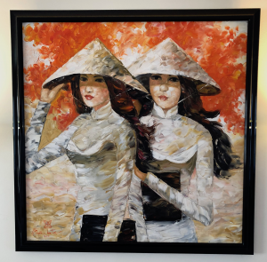 Why Vietnam 50 years after the fact? Mostly because we Americans still see the war through our own lens: the draft, the anti-war movement, the hippies, Agent Orange, Nixon’s election. But what about the other side? How did the Vietnamese see it? What were the repercussions on them, during and after when the Communists took control? I wanted to explore it through their lens, particularly since so many Vietnamese ended up in the United States themselves. Btw, I already had the idea for the story, but then I saw this painting in Saigon (Ho Chi Minh) city. I had to get it; I think it could be part of the cover, don’t you?