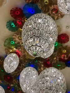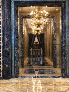 For example, the 5 star hotel we stayed at, The Reverie, which I learned was built by a Chinese investor and his Vietnamese wife, was in the heart of downtown Saigon and clearly over the top. We were met at the entrance with a Chihuly on the ceiling (I kid you not), and that was just the beginning. Here’s the ceiling and the Italian marbled entrance to the elevators on the ground level.