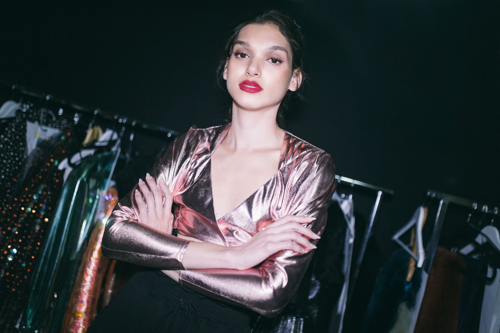 La colección se compone por enteritos, abrigos, chaquetas aviadoras, pantalones, tops, faldas, vestidos de cóctel y guantes de siluetas que recuerdan los 80’s -90’s matizadas a través del uso de colores contrastantes y energéticos, con el negro como base y los metalizados y brillos como protagonistas.