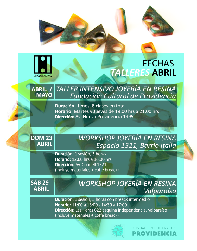 también lo piensa. Por eso decidió desarrollar workshops, que le permitiera transmitir el arte de fabricar joyas en resina a todo quien lo deseara. En este contexto nacen los talleres que llevará a cabo de Santiago y Valparaíso en abril. ¿Te gustaría participar? Acá te cuento cómo.¿A quiénes están dirigidos los talleres de Uno es a Uno?