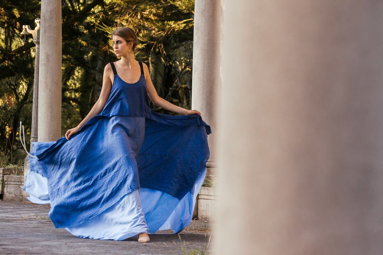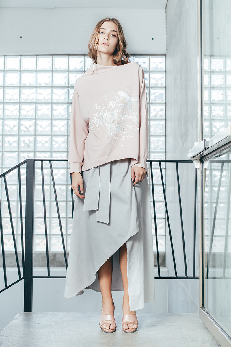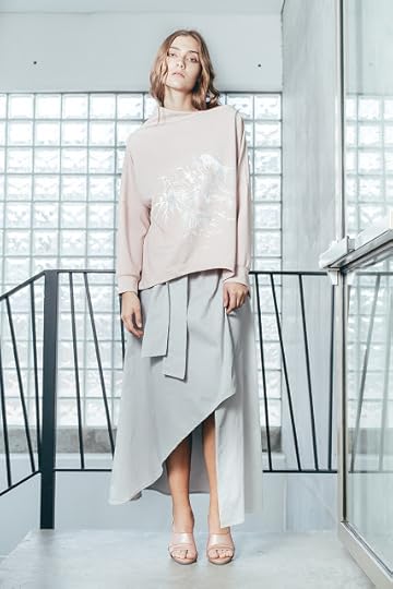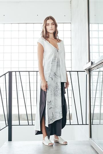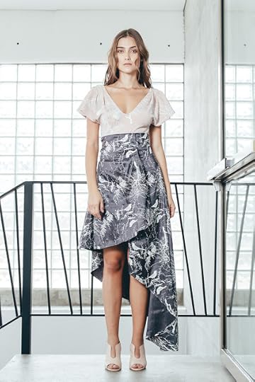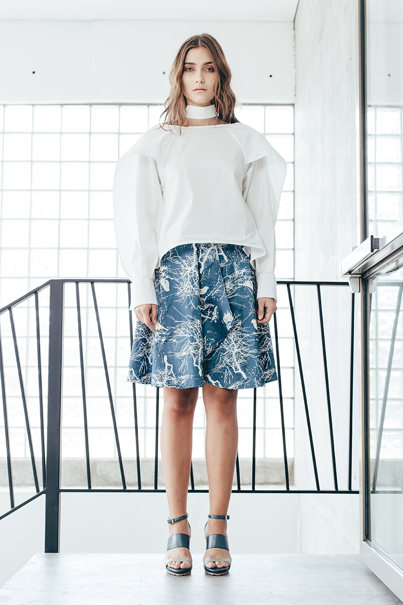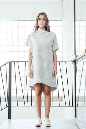 "Etérea está definida por volúmenes orgánicos, a través de piezas atemporales. Busca el equilibrio de las siluetas de forma tranquila destacando un estado elevado de sutileza, que se expresa desde el interior, desde lo sublime de la esencia femenina y se refleja en prendas hipotéticamente flotantes con capas de vuelo que buscan movimiento natural y ligereza en algodones puros, con elastómero y tafetanes intervenidos con texturas únicas desarrolladas artesanalmente plasmadas en relieve.