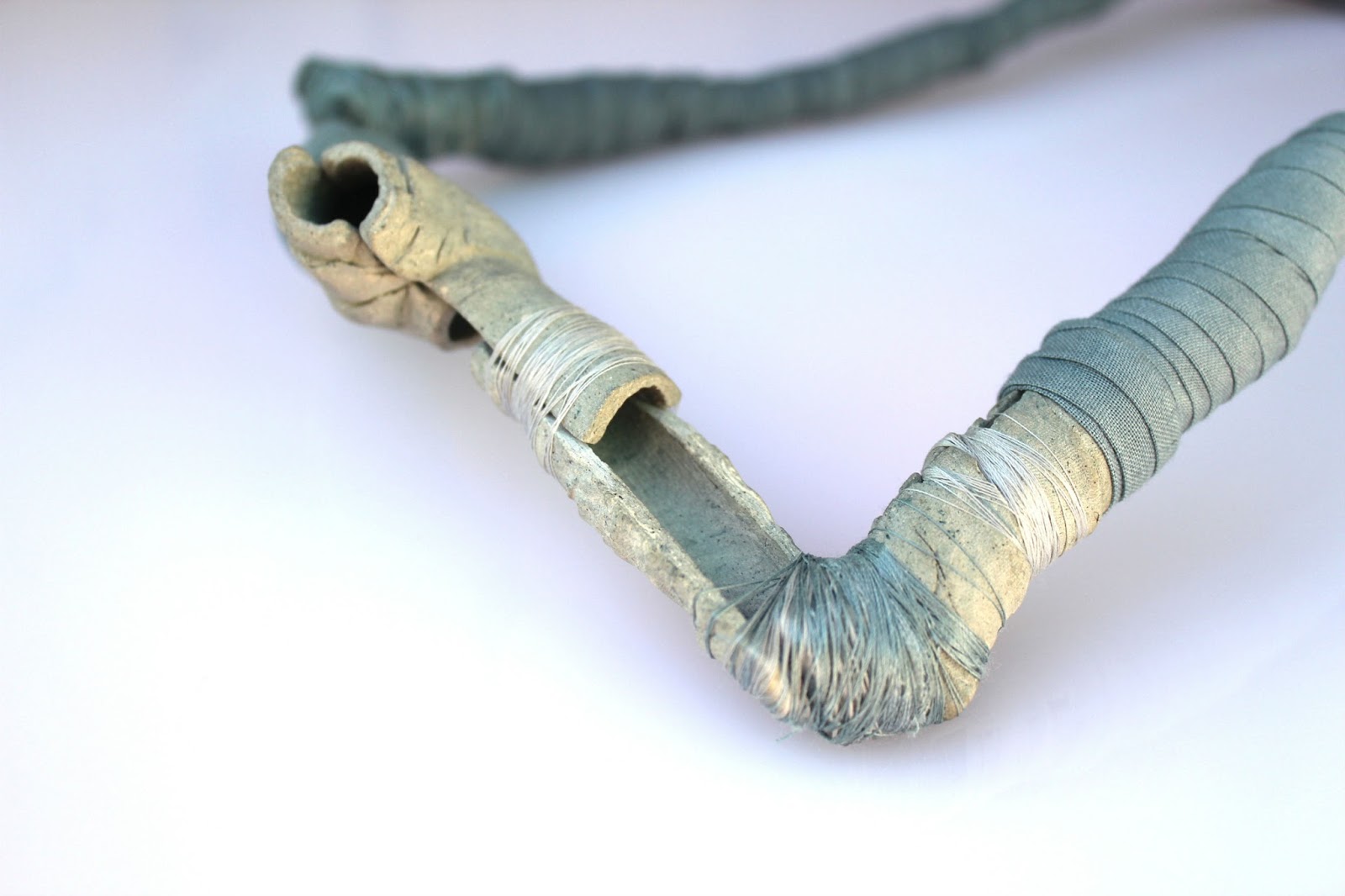 Cada material trae bastante información, y ocurre una especie de lucha entre lo que uno quiere lograr y lo que el material quiere hacer por si mismo. Lo que me atrae de la cerámica es su transformación, pasa de ser un maleable barrito a quedar pétreo después de la quema, fuerte y frágil a la vez, puedo darle la textura y el color que yo quiera, funciona como gema para algunas de mis joyas, o como elemento estructural para otras. Suelo combinarla con materiales de apoyo como el metal, y las telas que puedo coser a mano, tomando en cuenta la riqueza plástica de cada uno, el color que cada materia trae en sí, un juego que me encanta realizar, se producen mímesis y contrastes que me ayudan a crear las composiciones de las piezas."