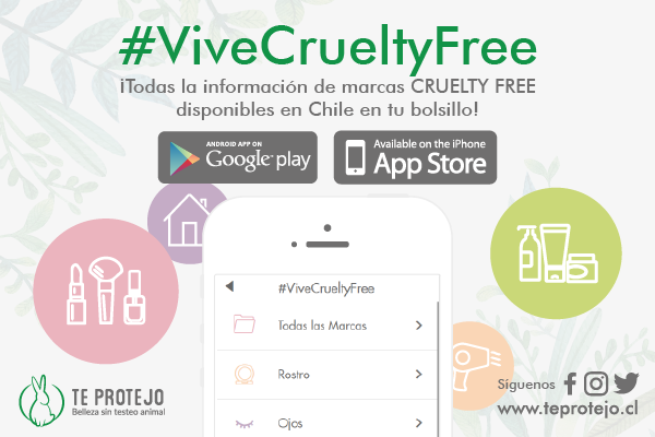 #ViveCrueltyFree, para descarga gratuita en iOS y Android, entrega el listado completo de marcas, a la venta en Chile, certificadas como no testeadas en animales por organizaciones internacionales como PETA, Leaping Bunny, CCF, Kara, One Voice, entre otras, y Te Protejo en Chile.