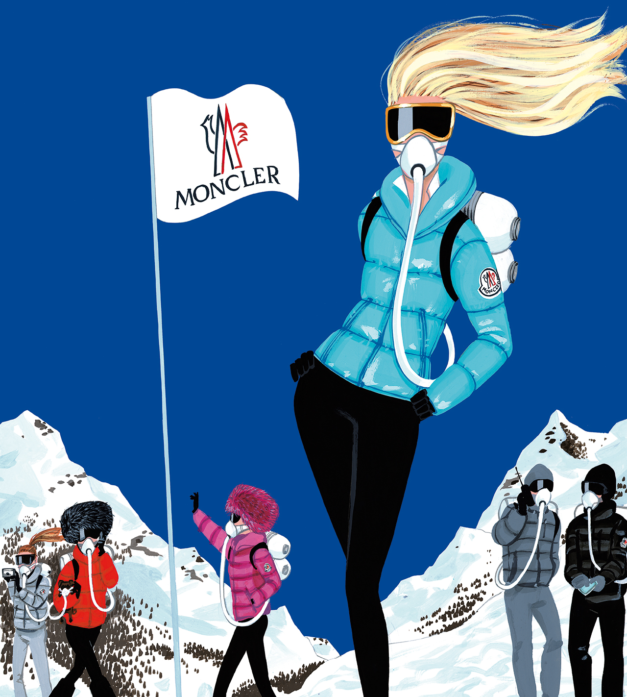 Jordi Labanda para MonclerActualmente en Chile son muy pocas o casi ninguna las marcas que apuestan por la ilustración y me parece que eso se traduce en un desaprovechamiento del potencial de esta disciplina. Tal vez faltan exponentes con más visibilidad o quizás también tienen temor, quienes toman las decisiones, a probar algo diferente de aquello que parece comercialmente más seguro. La globalización funciona en algunos ámbitos de la moda, como las tendencias, pero en la ilustración no se experimenta la misma instantaneidad y espero sinceramente que eso cambie.