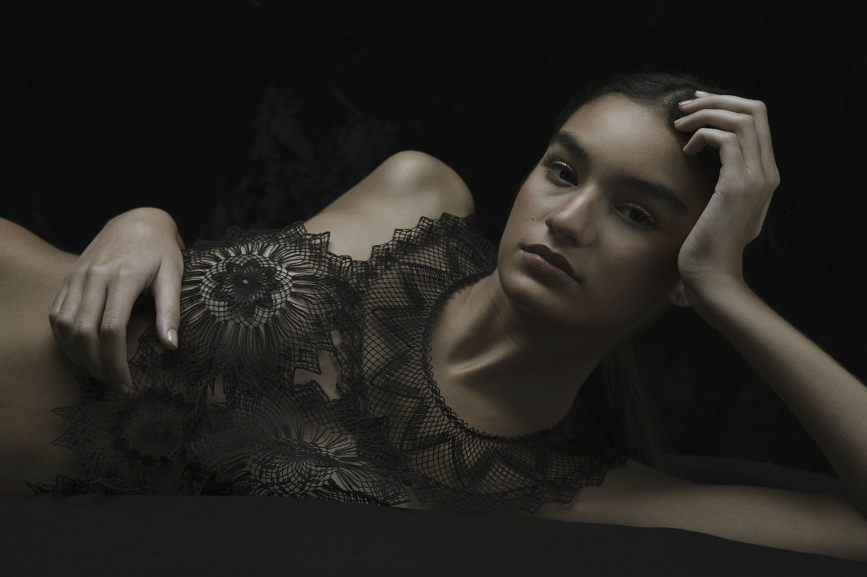 Esta colección se desarrolla en un juego de contrastes y mezclas entre los rasgos propios de una cultura ancestral y un lenguaje digital caracterizado por un gran impacto visual. Acá están los géneros más delicados de mi colección y mi muestra más fehaciente de que sigo el lenguaje de las comunidades de artesanas. En el caso del tejido de randa se presenta en todas sus escalas y grosores de hilos: finos y de coser (como se usa de manera tradicional) hasta cordones de algodón para lograr macro escalas. El tejido en randa de color negro también se podrá ver en piezas blancas. Hay mallas tejidas en randa bordadas y mallas sin bordar. En cuanto a los estampados de la colección, estos pasan por todas sus escalas de micro a macro en color completamente negro. Los colores para esta colección son: blanco y negro".